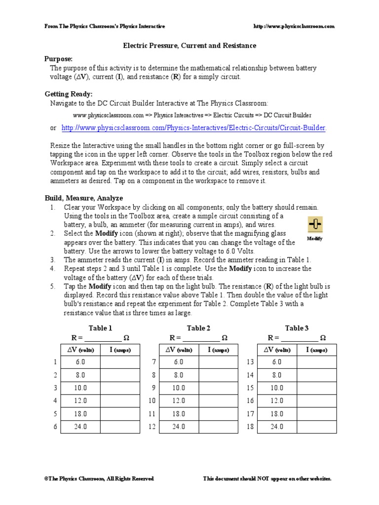 Virlab Electrical Pressure Current Resistance Pdf From The Physics Classrooms Physics Interactive Http Www Physicsclassroom Com Electric Pressure Course Hero