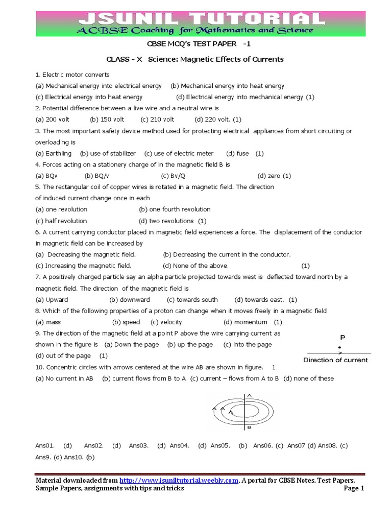 10th Magnetic Effects Of Currents Mcq 1 Magnetic Field Electric Current