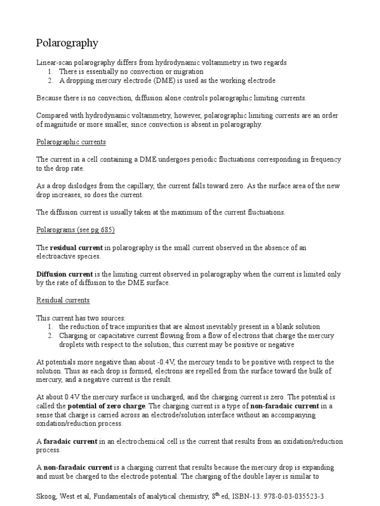 It is a type of voltammetry. Polarography polarographic analysis is a method of analysis based on the measurement of current electrolysis of an electroactive species at a given electrode potential under controlled conditions. It is the branch of voltammetry where the working electrode is a dropping mercury electrode dme or a static mercury drop electrode smde which are useful for their wide cathodic ranges and. The sensitivity and the detection limit of dpp are better for nernstian processes while for dc and np polarography they are independent of the type of the processes.